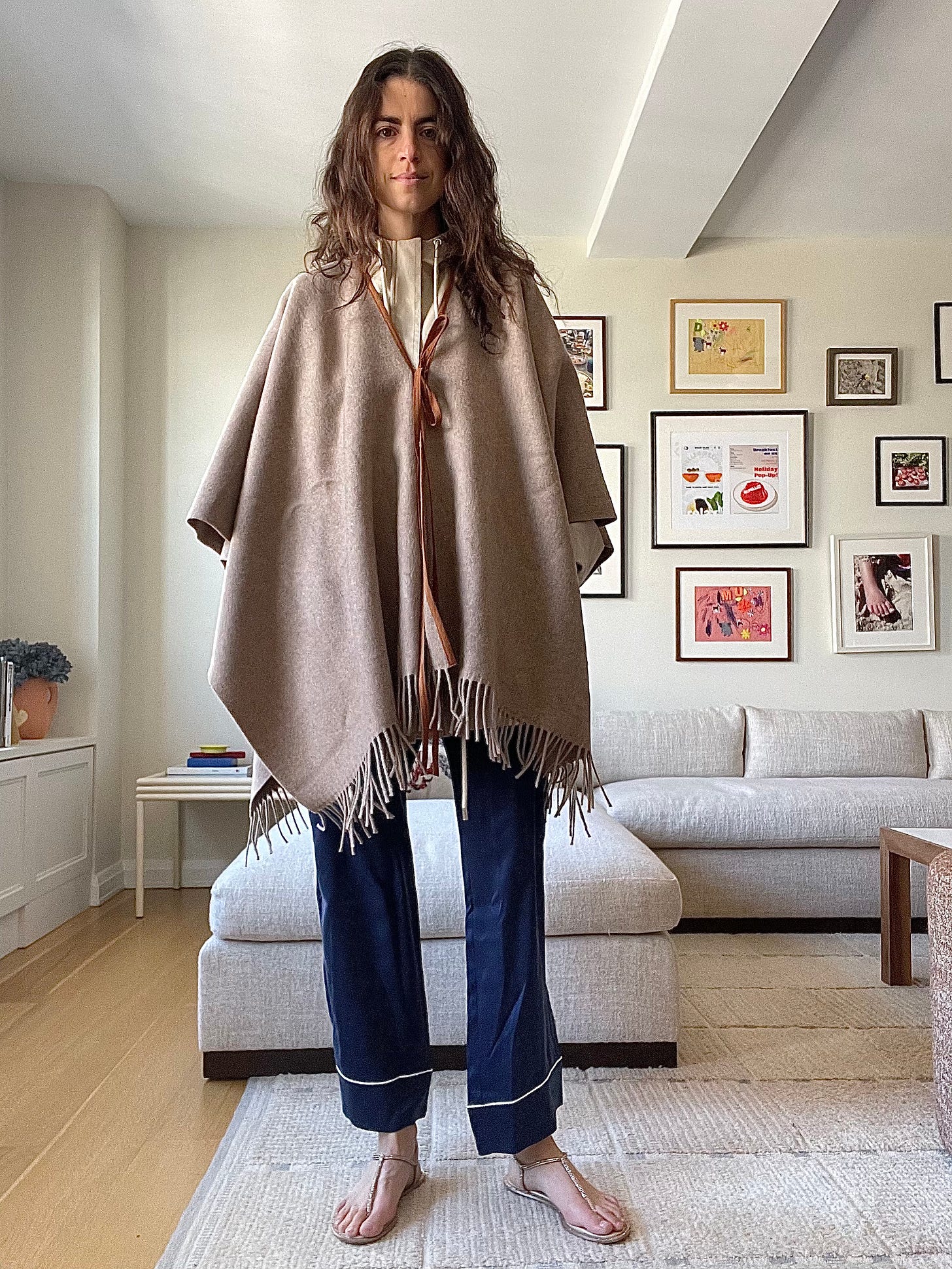 Sleeper poncho, Polo pajama pants, Rene Caovilla shoes; a good alt could be a pair of metallic flip flops, like these from Tkees