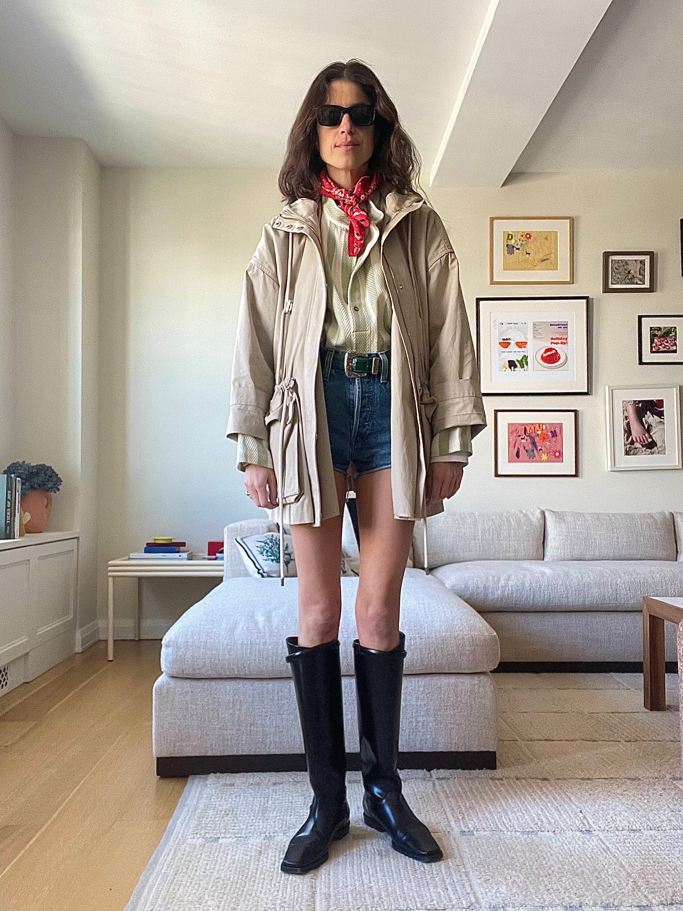 I think part of what makes the jacket work is the length and where it hits — about mid-thigh, which compliments the oversize pockets that rest over the front of your hips when closed. Rest of the look includes an Attersee shirt, Sable World belt, Re/done shorts, Toteme boots and a red bandana