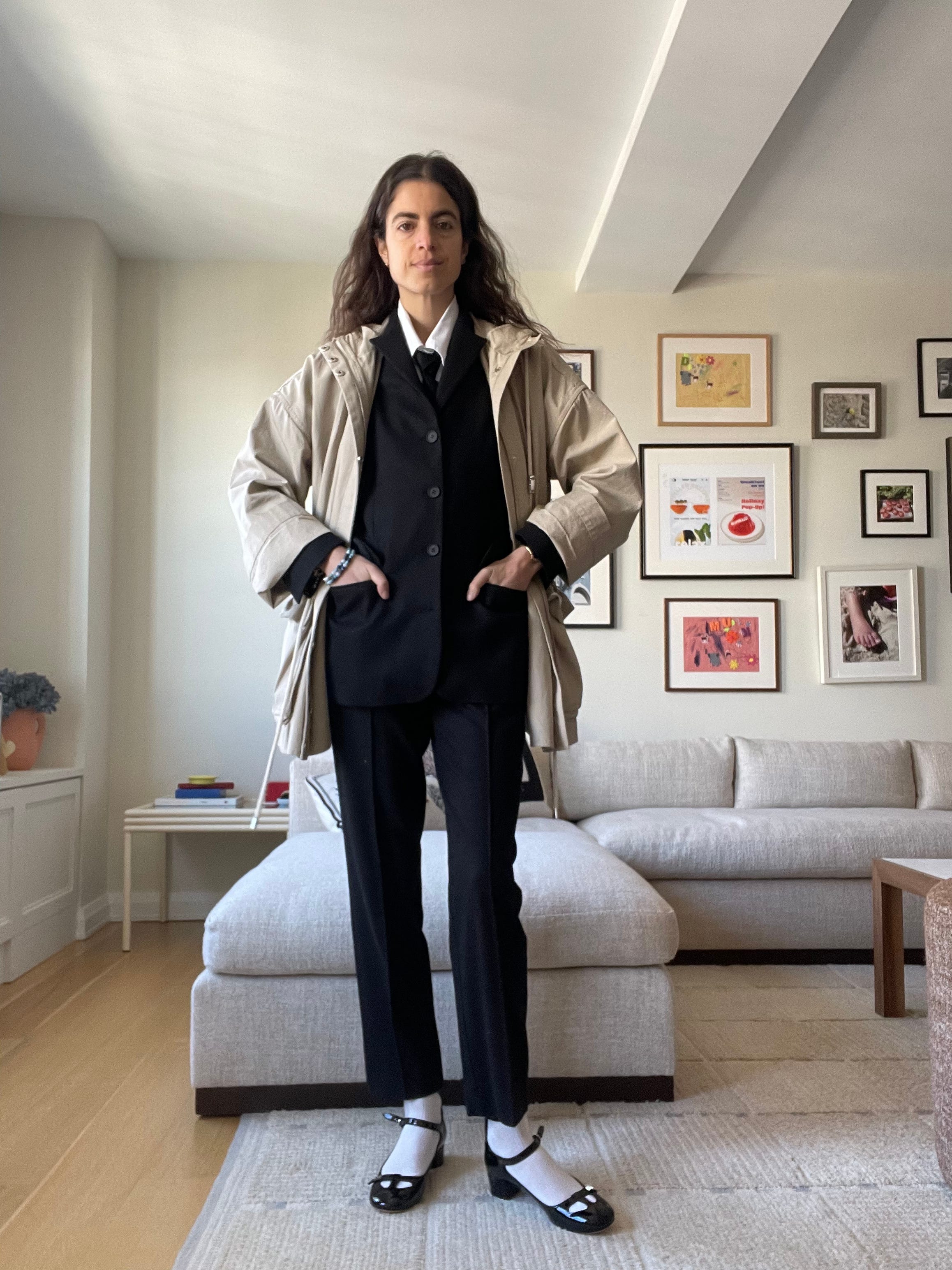 The jacket also meshes very well, I realize in retrospect, with an underlying turtleneck. It’s a good compliment for it. The belts here are Khaite, the socks are from Ines, the slingbacks are Louboutin; the shape on these is actually pretty similar