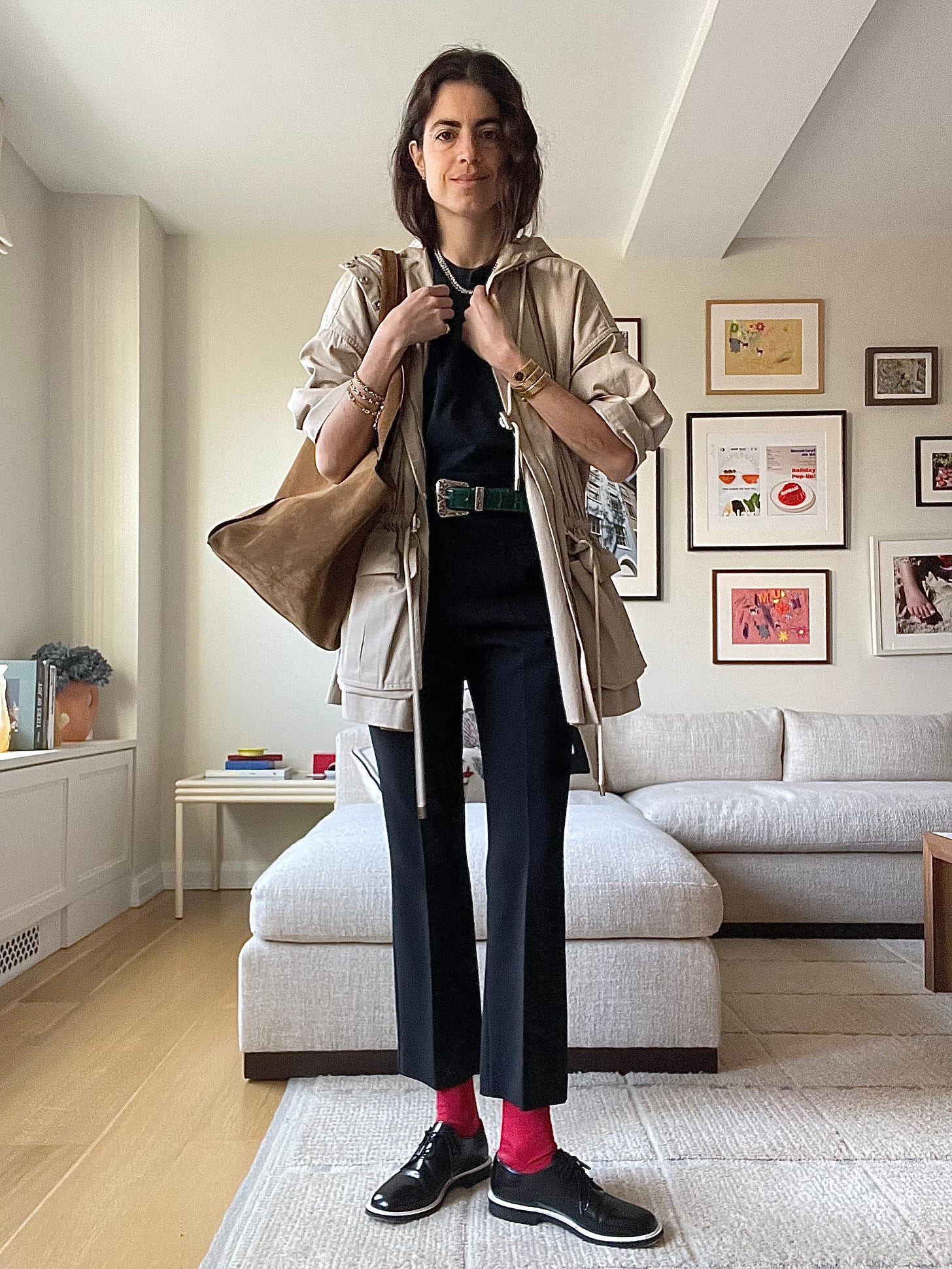 Socks can do that too (add playfulness). Here’s the jacket styled with a plain black t-shirt, black trousers (Max Mara’s ‘Nepeta',’ which are seamless [as in, no zip fly]; here’s a better-priced option from ‘S Max Mara with seams. The former looks better with a gratuitous belt; but both are great). The derbies are from The Row, here’s a good pair of red socks, and the bag is Metier. (This is an option at a more accessible price point)