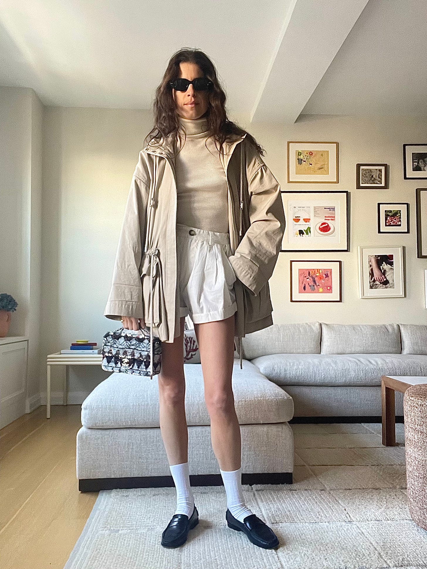 Raey turtleneck, Doen shorts, and if you’re looking for a good pair of white socks, I recommend these. They’re not too fine, but also not so stiff that they look too much like sport socks.
