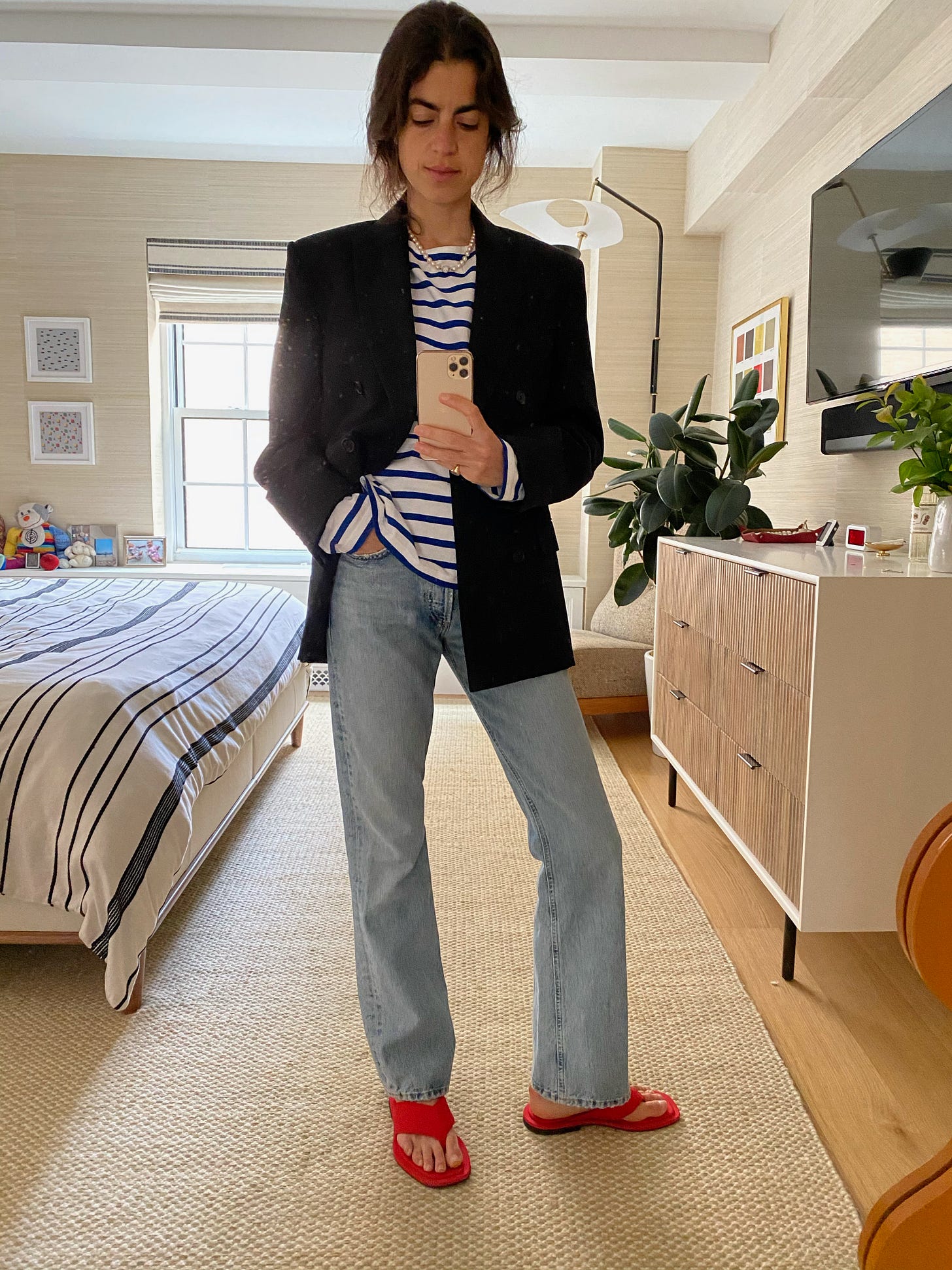 By now you also see we’re dealing in the currency of a double breast blazer, as boxy as the t-shirt (though if your preference is one that is more fitted, you can just as easily wear that and tuck it in), loose fit as the jeans. This is the style I tend towards but if you’re working with another type — single breast or fitted, I suggest a tank top (love this one by Doen) tucked into wide-leg jeans or kneecap leggings (these from the Gap should do the trick and are 40% off) and the jacket button closed (like in photo no.1), respectively speaking. If you’re shorter, you’re going to want to wear a blazer that either crops right on your ass cheeks or just above them (this one from Zimmermann on The Real Real is pretty good).