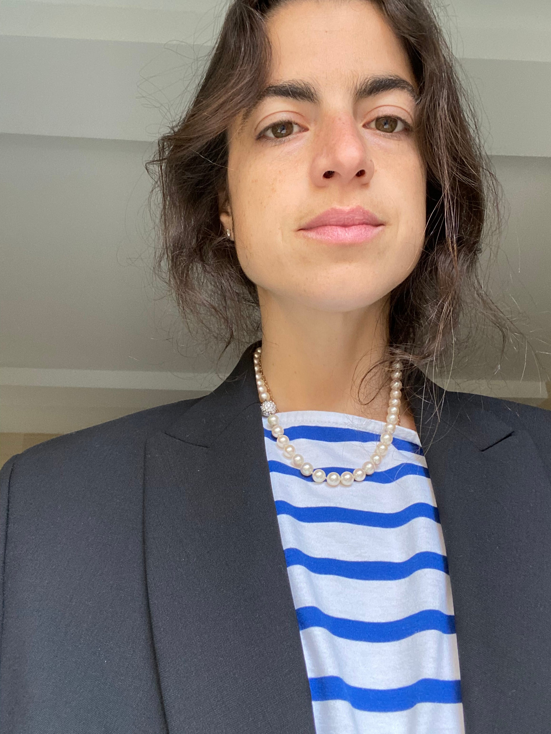 I often don’t like to wear a necklace over a boat neck collar, but when I put the blazer on, the neckline starts to slouch, which makes it look kind of like a necklace itself, and that creates a sort of layering effect over the pearls. It’s messy, but not — the “stick up” to your “ass,” magnifying just how anal the beads (pearls) really are.