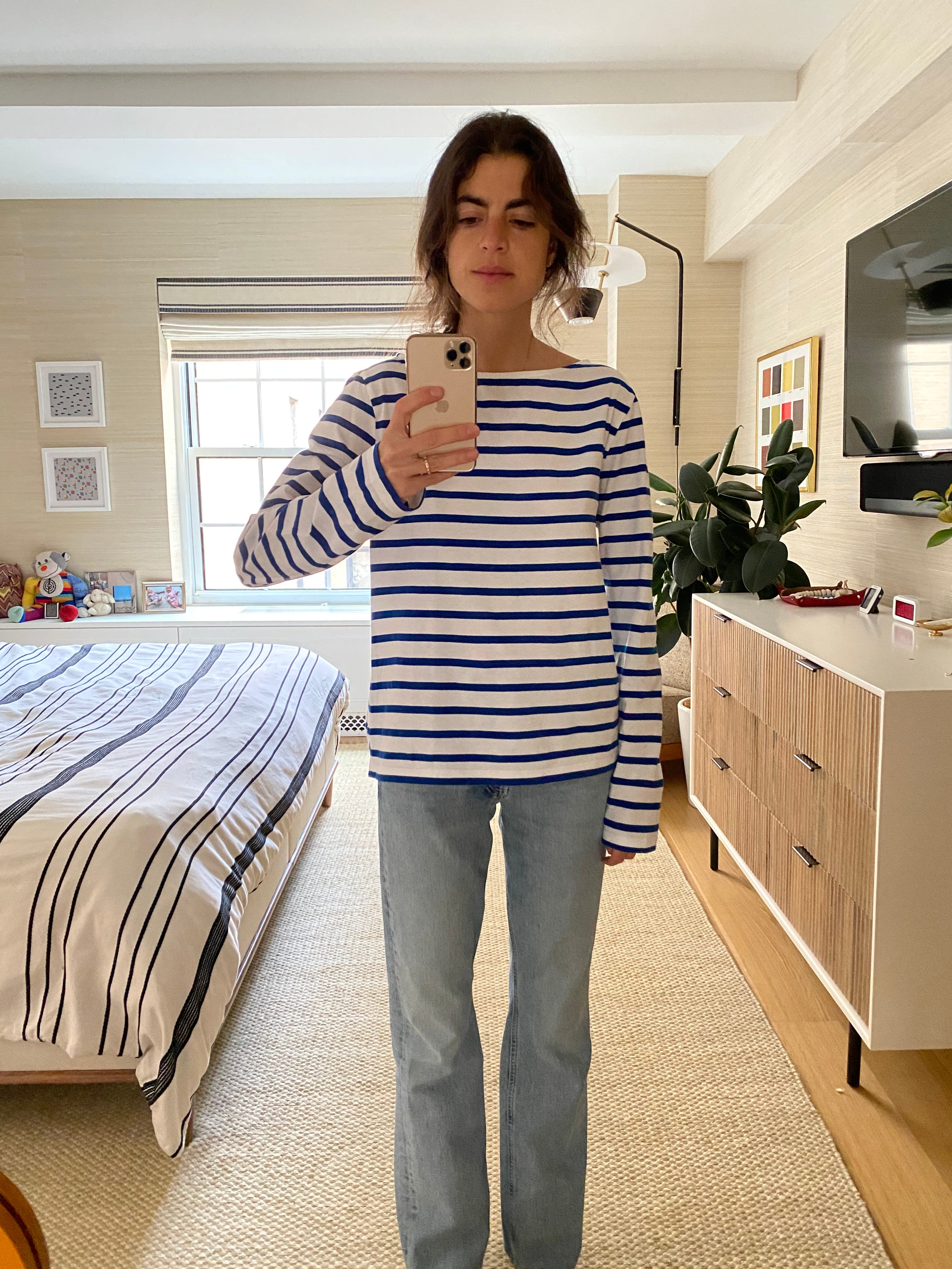 A boat neck cotton shirt that is long sleeve and striped (La Ligne). Plain gray works too (I like Kule or Gap for these). So would something graphic (Jessica Biales makes cool seashell t-shirts).