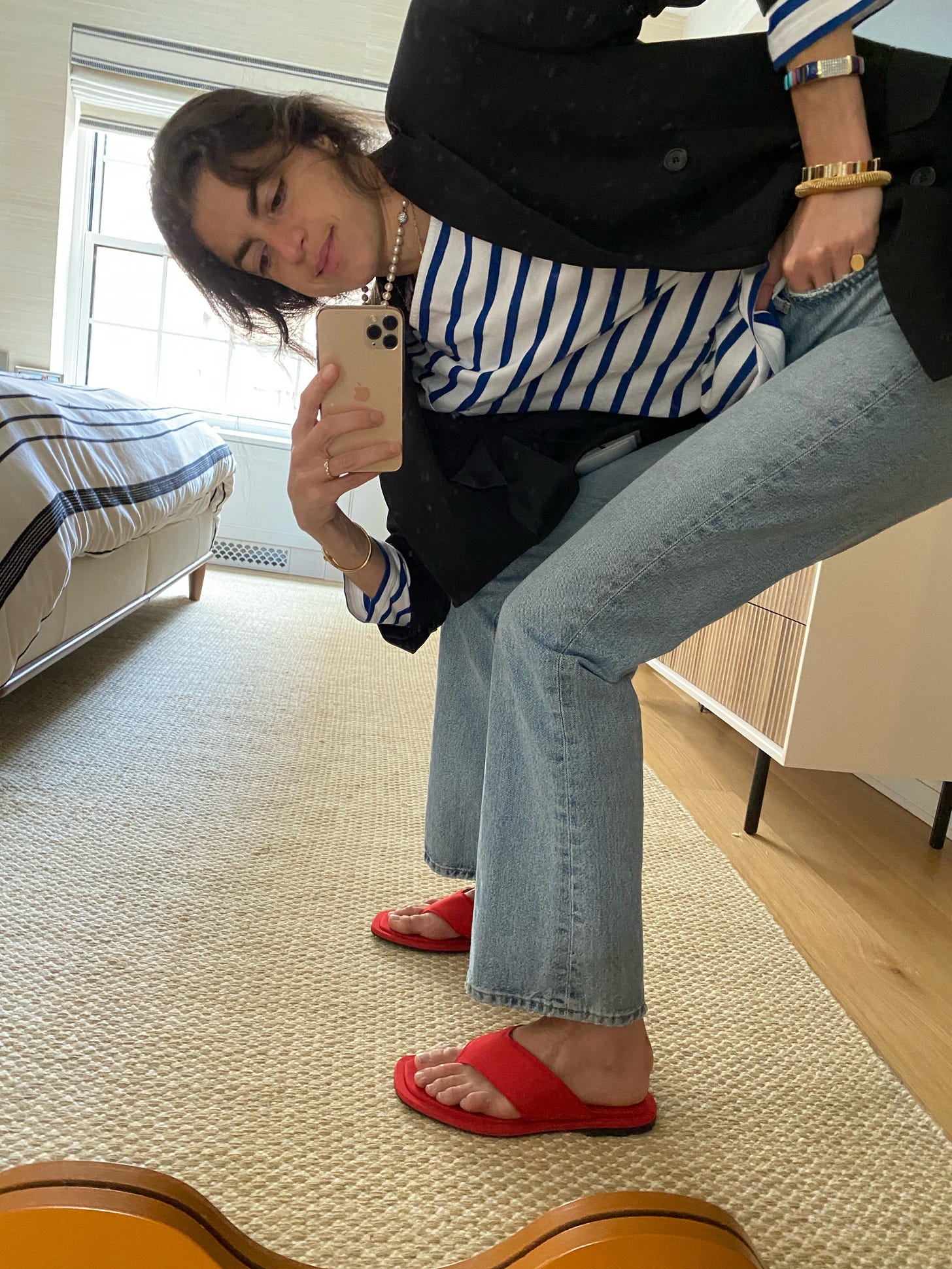 We can talk about this in another installment, just tap reply and tell me you want to — but for now, because I am wearing reg pants with the blazer, I’m also wearing what I consider to be a great solution: ugly sandals.