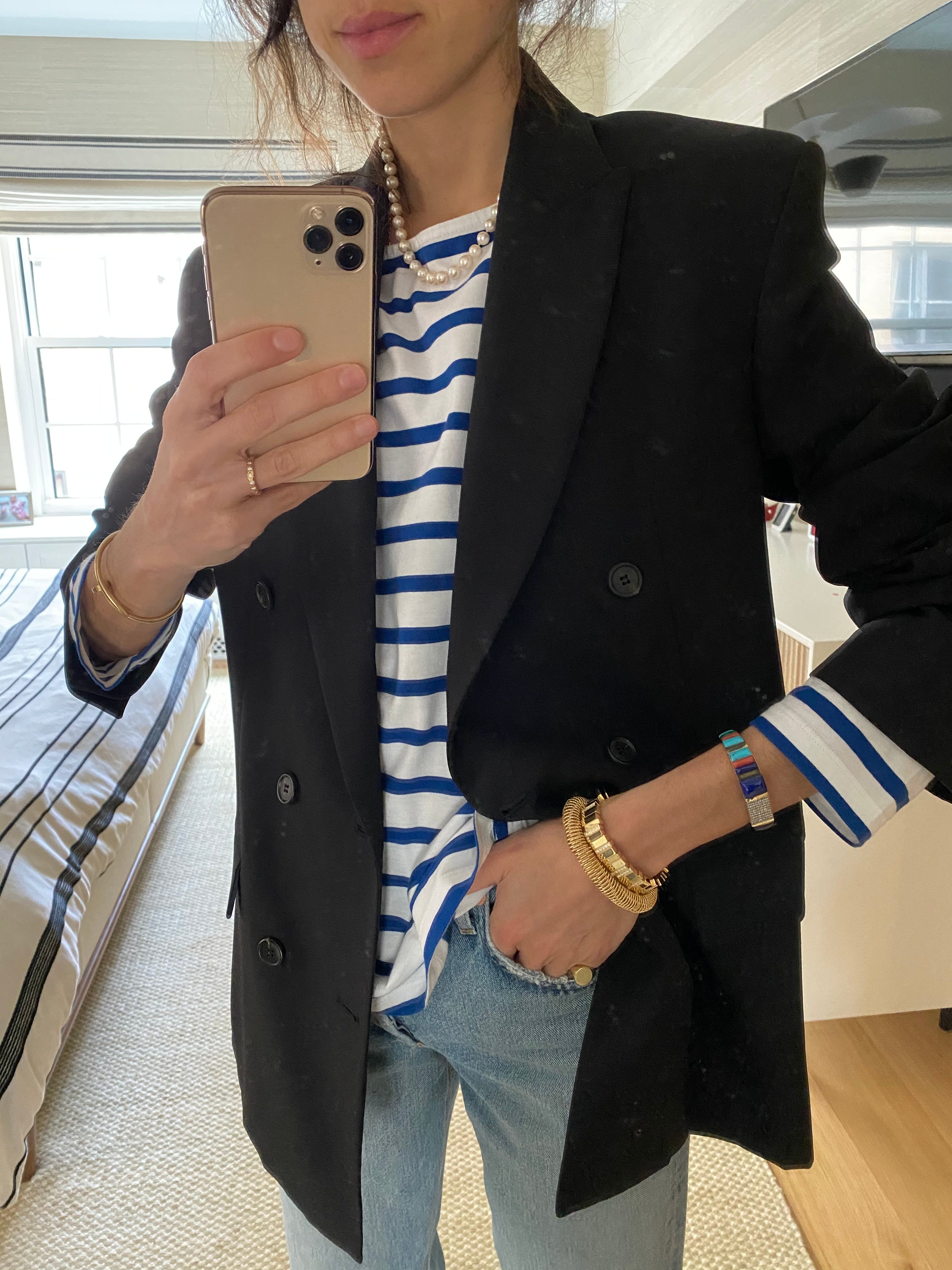 We’ll add the blazer, sure, but also a strand of pearls. They don’t have to be pearls — it’s my preference because of the way they contrast the mariner stripes, the latter of which have become as informal a marker of casualwear as, say, ripped jeans or an army jacket. So the pearls add some polish — the “stick up” to your “ass,” but in a good way. Honestly, though, opals, a gold chain, a silver chain, or some warm-colored (red, orange, even yellow) beads will do.