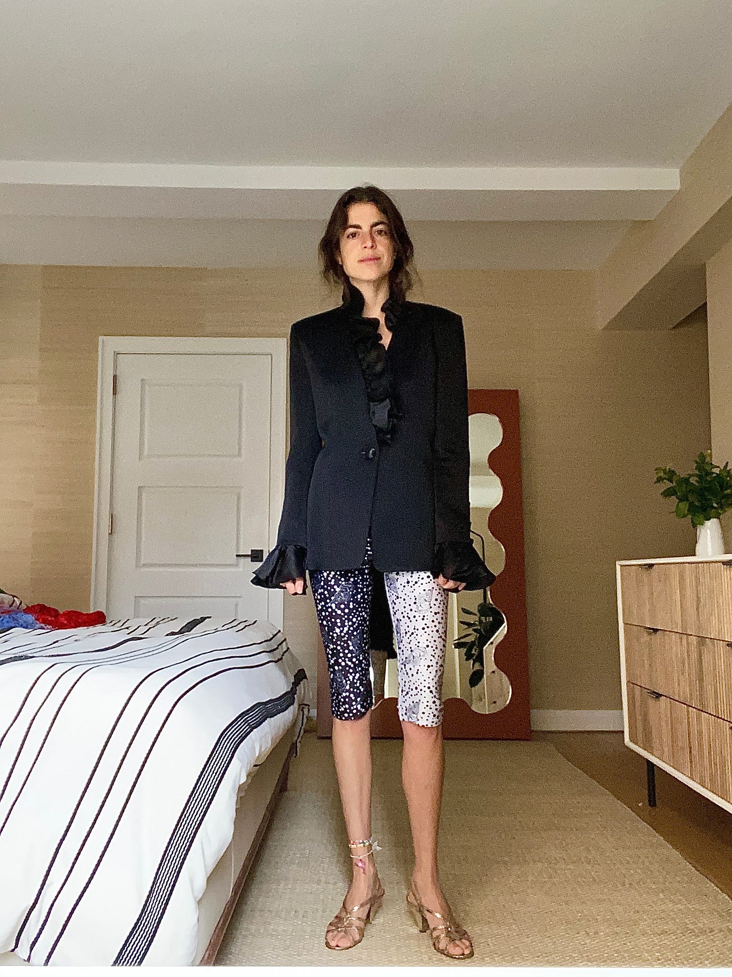 But this advice isn’t scalable. It requires that you own a blazer that’s not boring, which maybe you do — in which case, I suggest pairing it with knee cap leggings and slingback sandals. I recently bought these sandals and walked 37 blocks while wearing them for the first time which I mention only to illustrate how comfortable they are. So that’s that — if you have a non-boring black blazer, just wear that. But don’t go out and get one if you don’t, there’s another solution and this is the one I’m going to spend the most time on because: