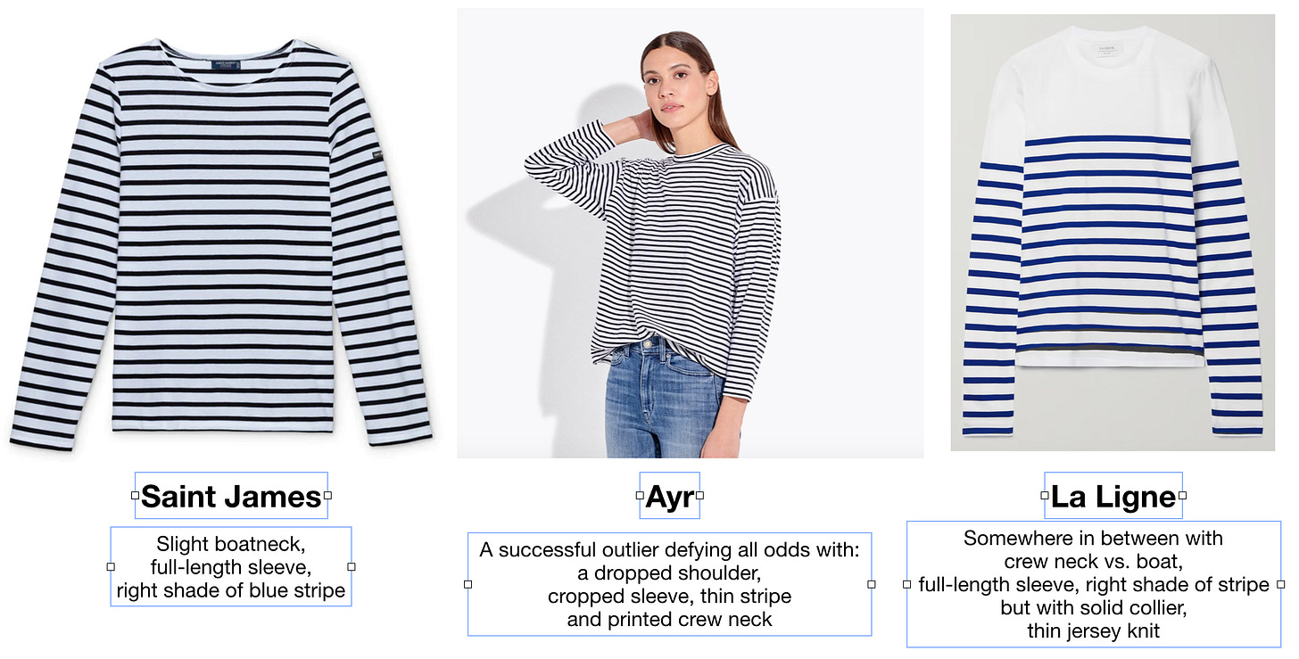 The shirt that I used to assess these value propositions is from La Ligne. I bought it in early 2021 (and can’t find it anymore, here’s the closest one) after I had dinner with my friend Samira, who was wearing one under a black collarless jacket with gold buttons. I couldn’t figure out why any time I’d tried to approximate a similar combo something just didn’t work until I realized from seeing hers that my stripe colors were off.