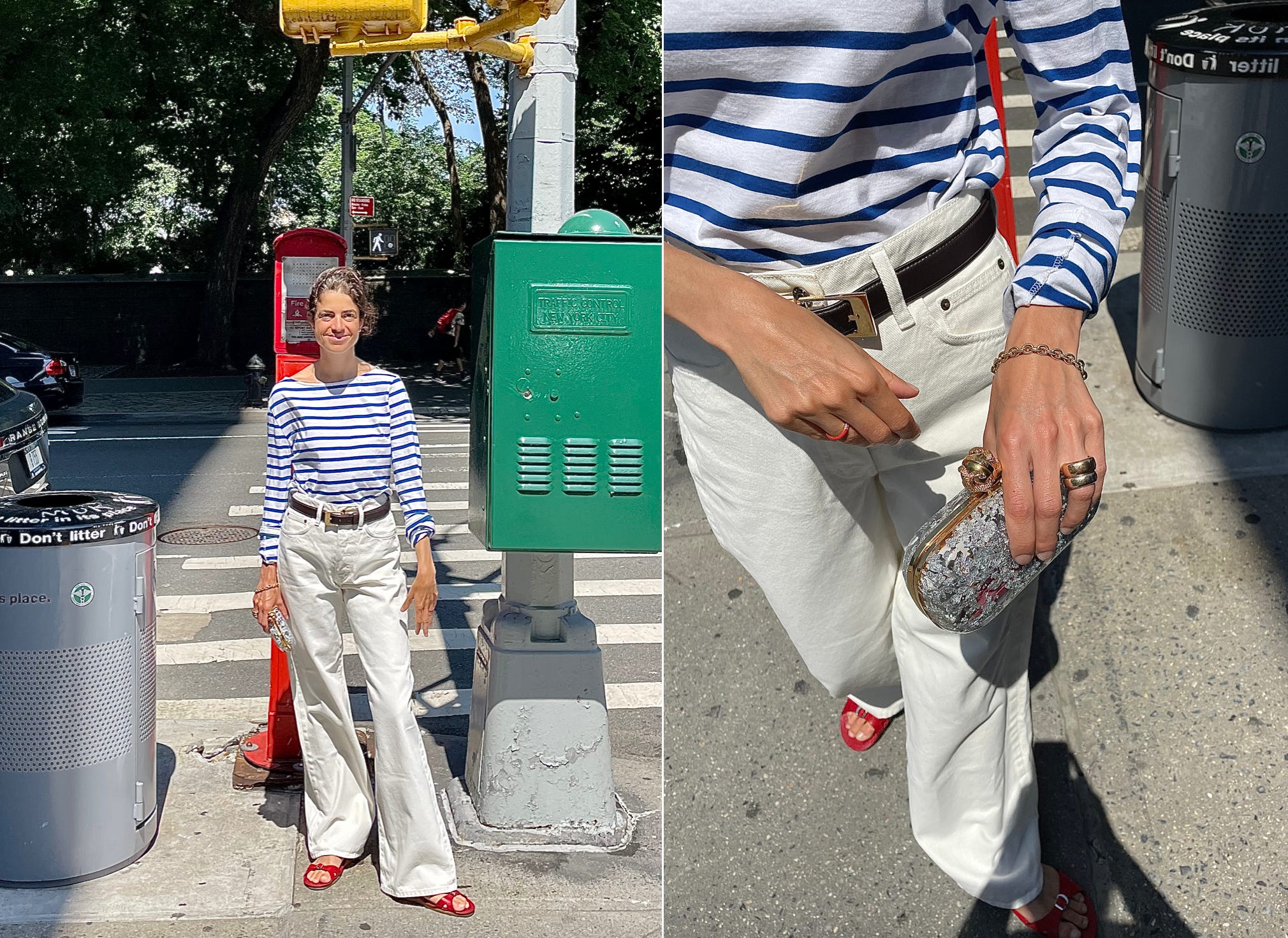 I should give credit to the silhouette of the jeans, more interesting than quotidian skinnies or baggies but the shirt does play a crucial role in bringing the picture together — the red sandals bring in a small bit of color and the fancier accessories (clutch, belt, cigar band rings) offset the casual nature of the shirt, which is actually the next point.