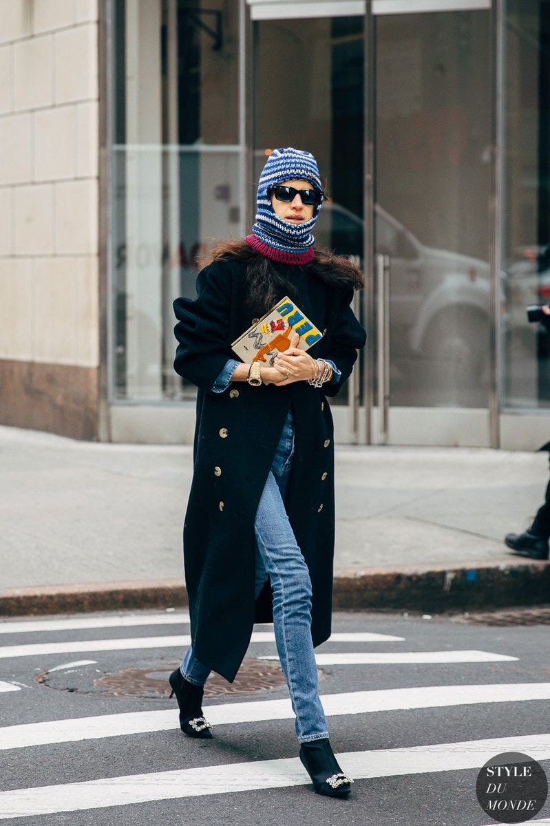 Length - Cropped coats rarely keep your ass warm although they do look better with wide leg pants, and make it easier to take giant leaps toward your dreams, or the grocery store — wtvr! But on balance I would say your best bet is like, 3-5 inches below the knee. Knee-length coats often read too perfect, like they’re just these eagerly lengthed garments that have never been late to a doctor appointment or run a single red light. But then, you know, if the length of the coat gets too long (stay 2-3 inches above your ankle), you end up feeling if not looking like a medieval sword carrier.
