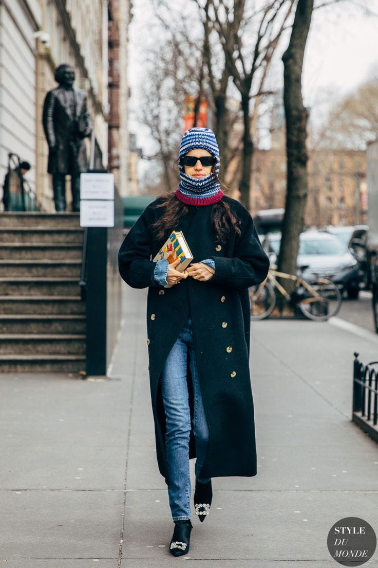 Color — If you wear a lot of it (I do), a neutral like camel is less harsh than black. If camel’s too light, try navy. If navy disagrees with your accessories, charcoal is a neutral like Switzerland. If you don’t wear much color: charcoal grey, black, navy, camel are great options. I’d say overall, charcoal grey is the ideal color. Pair it with brown, no problem. Ditto that beige. No brainer with black, easy with navy. I bring these colors up in particular because they’re considered the neutrals of winter but also carry these awkward rules I am sure many of us have internalized (like brown and black clash for example — not according to Prada!).